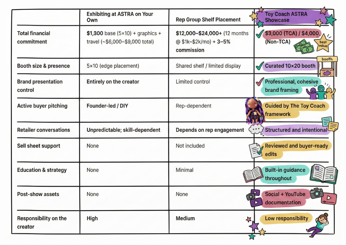 The Toy Coach Showcase is a guided, done-with-you ASTRA trade show experience for first-time exhibitors who want real exposure and real learning, without taking on the full cost or complexity of a solo booth.